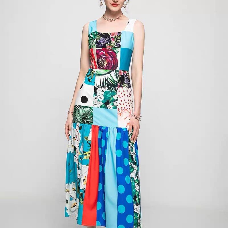 Pinkoz ロングドレス ランウェイ ぬるぬるドレス サマーパーティー セクシー ボヘミアン ビーチ シックなプリント スパゲッティストラップ ピンク 夏物