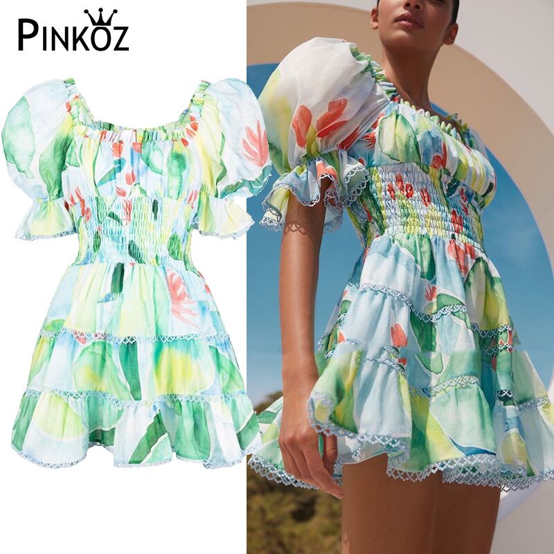 Pinkoz ファッション vestidos ヴィンテージ パフ スリーブ夏自由奔放に生きる緑花柄ミニ ドレス カジュアル弾性待機シャーリング高品質 ピンク エラスティック 伸縮 サマー 夏物 グリーン ビンテージ