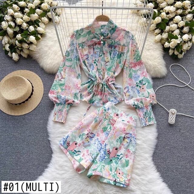Pinkoz レディース ショーツセット ランウェイ フレアスリーブ レースアップ スタンドネック フリル ブラウス シャツとワイドレッグ ショートパンツ 2ピース アウトフィット ピンク ラッフル ブルマー