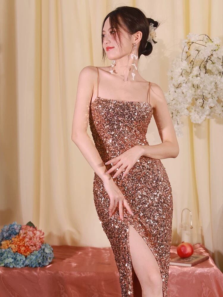 Pinkoz 女性パーティーセクシーなドレスゴールデンスパンコールスパゲッティストラップミディスプリットぬるぬるドレスキャミソール夏のファッションナイト vestidos za ピンク サマー 夏物
