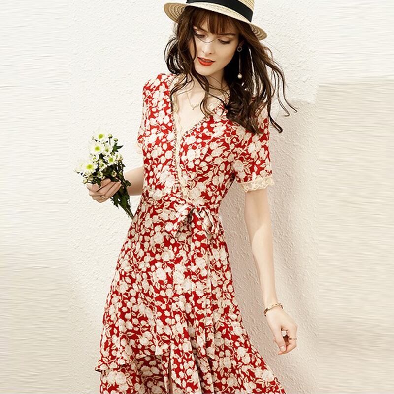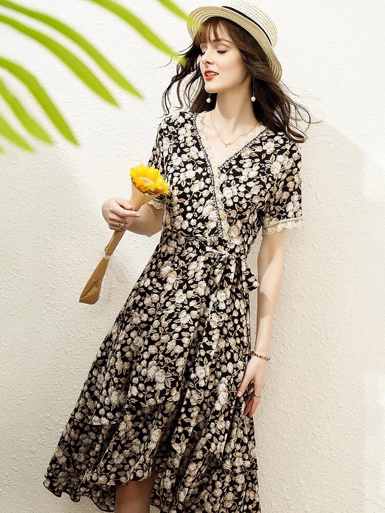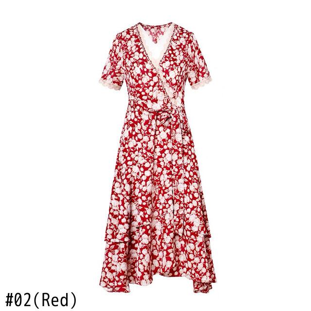 Pinkoz elegan サマードレス非対称半袖フローラルプリント v ネック女性パッチワークレースビーズパーティービーチドレスローブ ショート ピンク ハーフスリーブ 夏物 花柄 Vネック