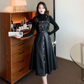Pinkoz ランウェイ デザイナー 2点セット ドレス 黒 セーター スタンドカラー ニット プルオーバー PUレザー シングルブレスト ボタン ローブ ピンク ブラック
