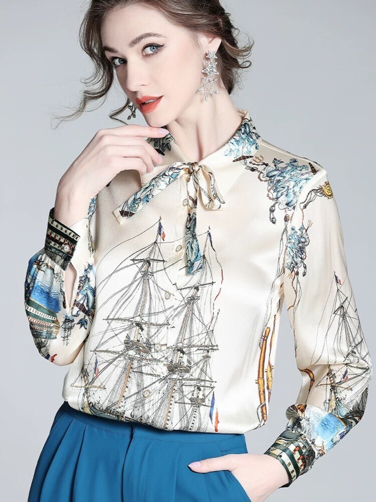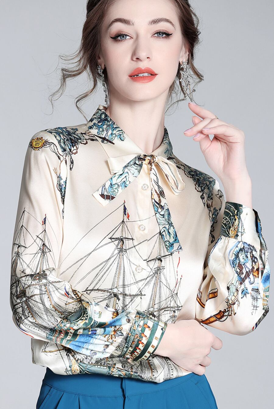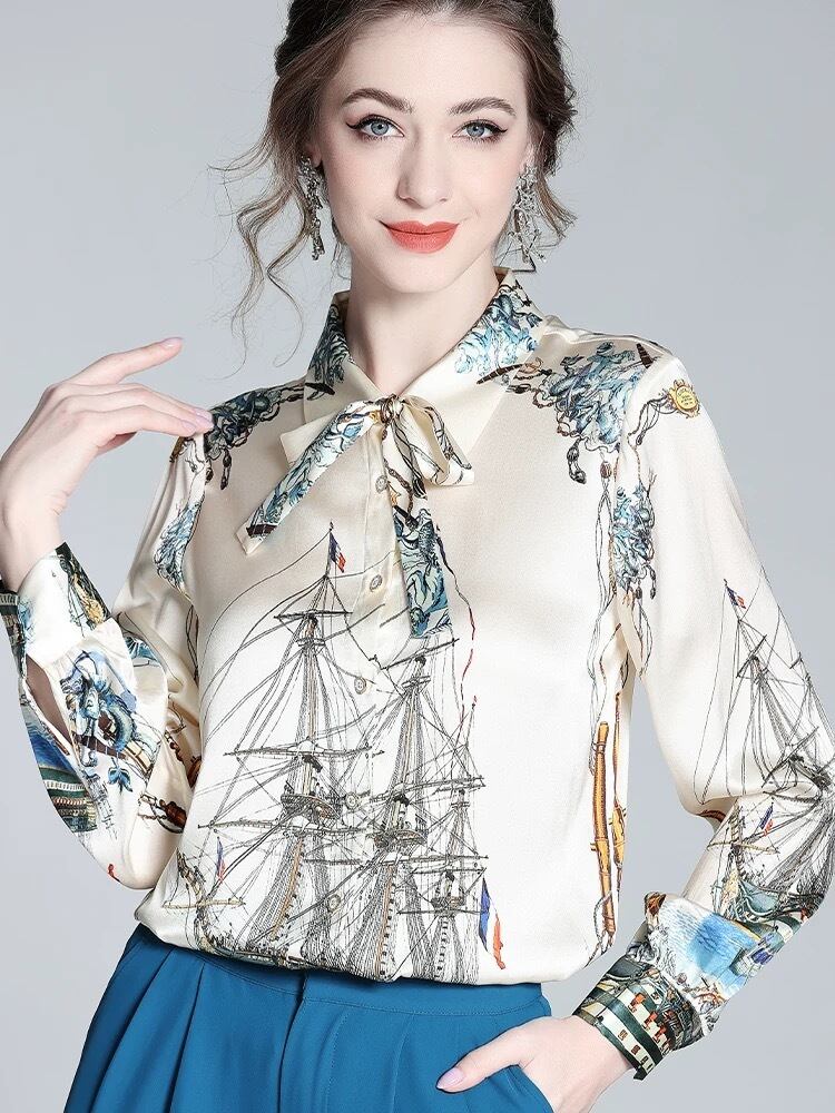 Pinkoz ヴィンテージ エレガントなアニマル フローラル プリント ボウ カラー ロング スリーブ サテン レディース ブラウス ルーズ オフィス レディー シック シャツ ファム トラフ ピンク リボン 長袖 花柄 フェミニン ビンテージ 会社 学校 通勤や通学にも