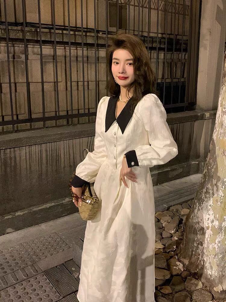 Pinkoz 女性デザイナー ホワイト ミディ ドレス ピーターパン襟ボタン A ライン エレガントなローブ デ mujer ファッション服 OL vestidos traf ピンク Aライン