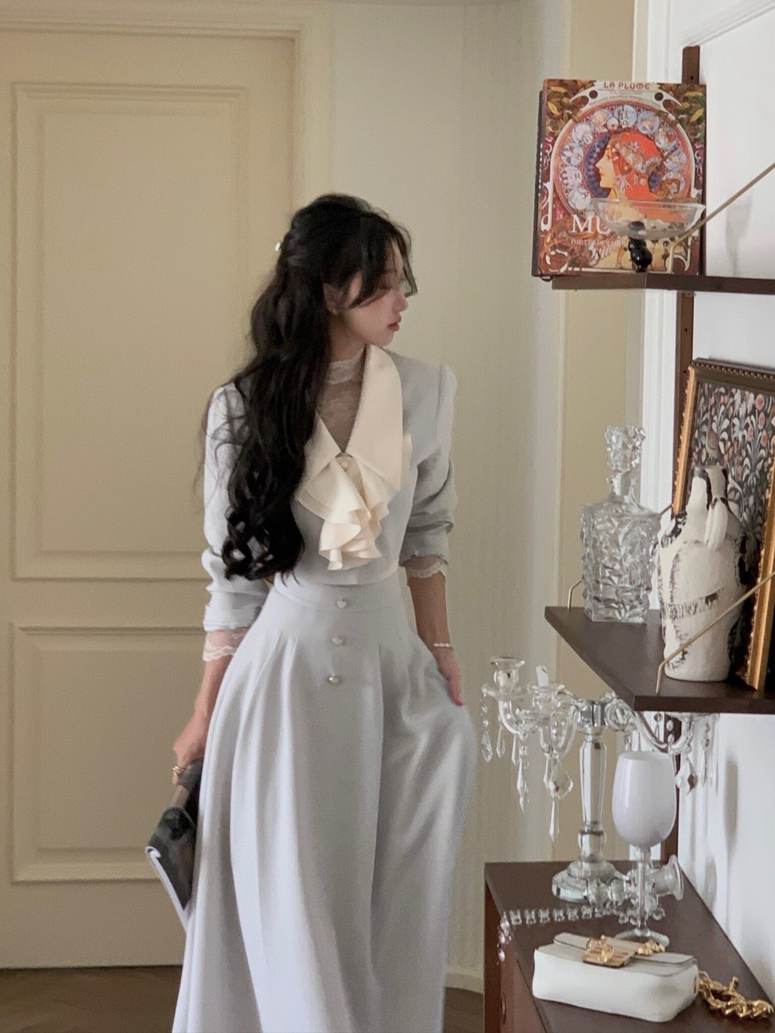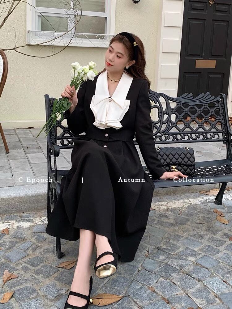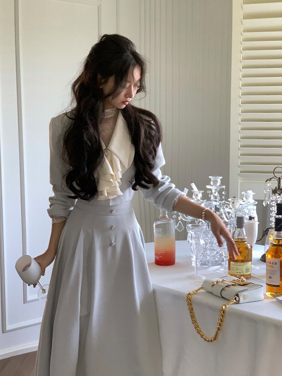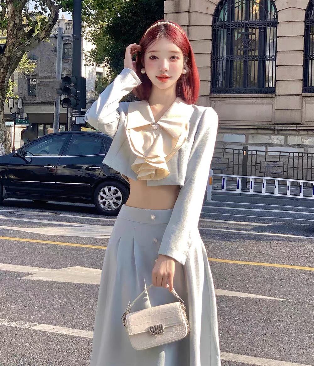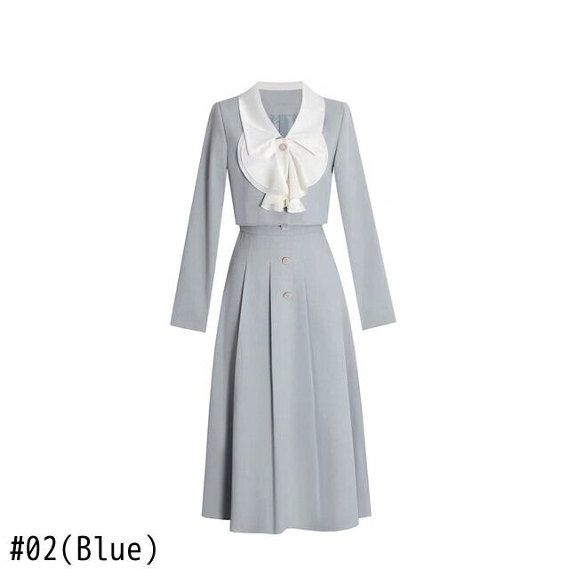 Pinkoz エレガント 2点セット 水色 リボンカラー ショートジャケット ブレザー+ミディ Aラインスカート ヴィンテージフレンチ風コーデ ファッション ピンク ブルー ビンテージ