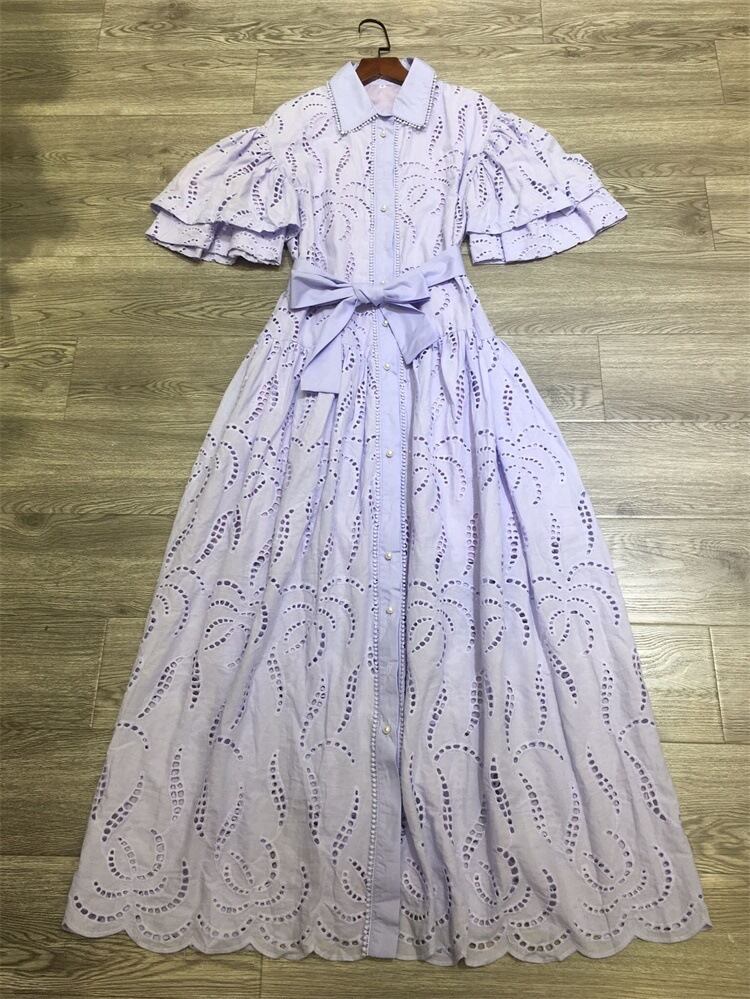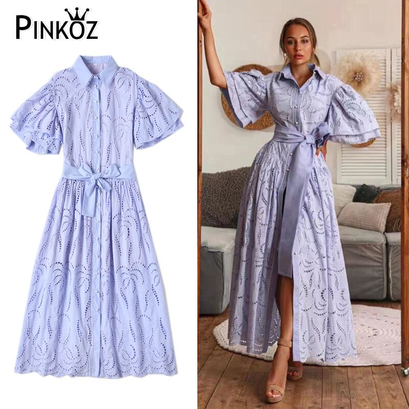 Pinkoz 滑走路デザイナーターンダウン襟蝶スリーブレース中空アウトハイウエスト女性ロングドレスパーティーエレガントな vestidos ハイウェスト ピンク