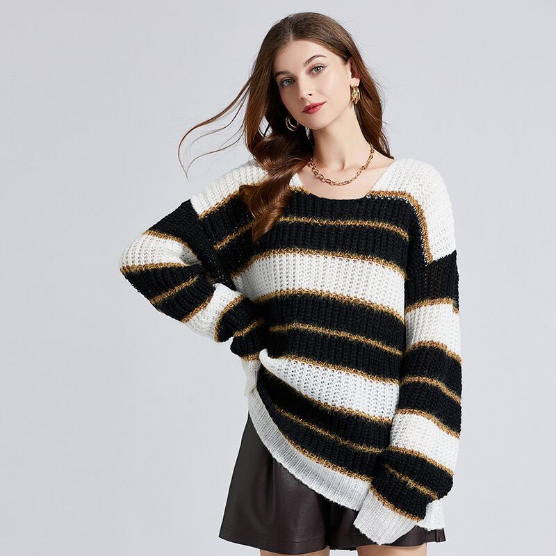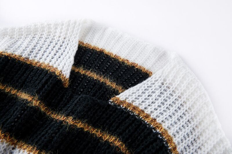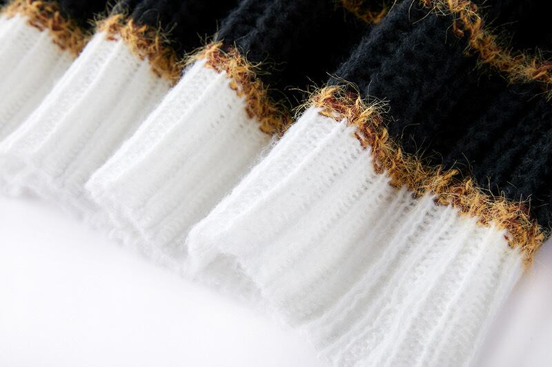 Pinkoz 女性ゴールドラインルーズブラックホワイトストライプドレス秋冬 O ネックセーター長袖カジュアルストリートヴィンテージ traf ロング ピンク オータム 秋物 ウィンター 冬物 Oネック ビンテージ
