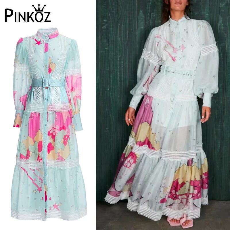 Pinkoz 女性自由奔放に生きるマキシ ドレス ライト ブルー プリント スタンド カラー パッチワーク レース シングル ブレスト ランタン スリーブ ロング ドレス ベルト付き ピンク ランタンスリーブ ハーネス
