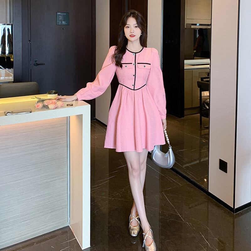 Pinkoz エレガントな O ネック ボタン フルスリーブ秋春甘いミニ ドレス A ライン ピンク カジュアル スリム ドレス vestidos デ フィエスタ 大人ガーリー スウィート キュート スプリング 春物 オータム 秋物 Oネック Aライン