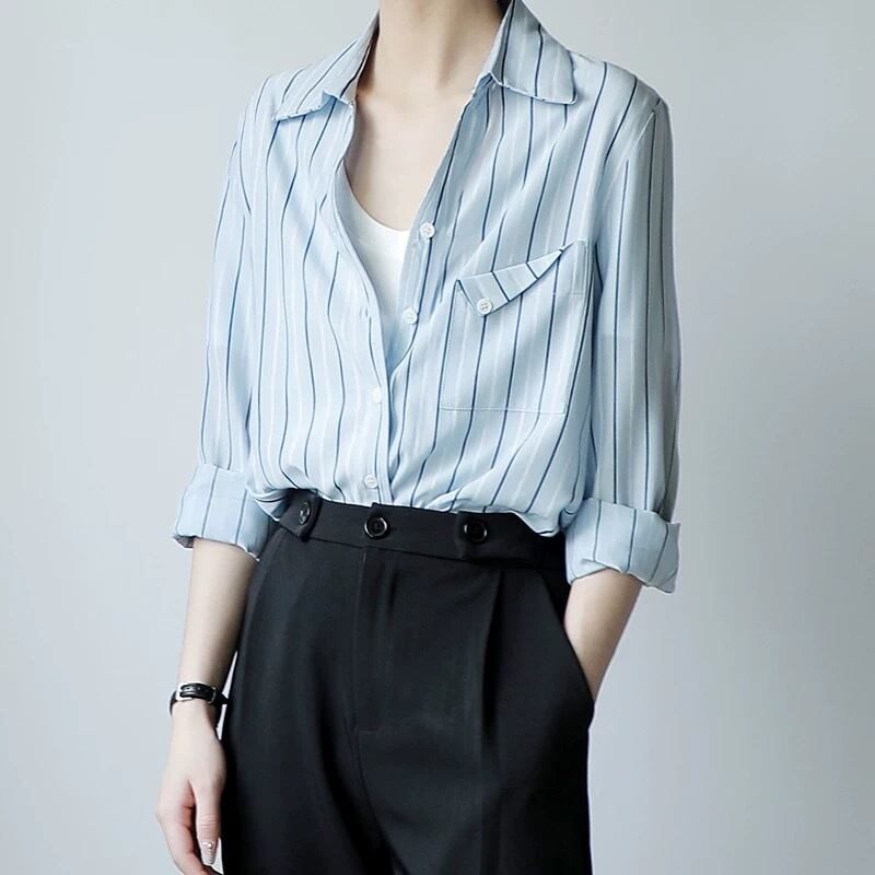 Pinkoz エレガントなブルー ストライプ ターンダウン カラー ポケット ルーズ シャツ カジュアル レディース ブラウス オフィス レディ ヴィンテージ blusas mujer de moda za ピンク ビンテージ 会社 学校 通勤や通学にも