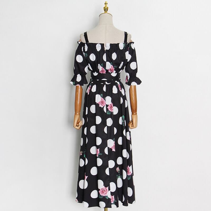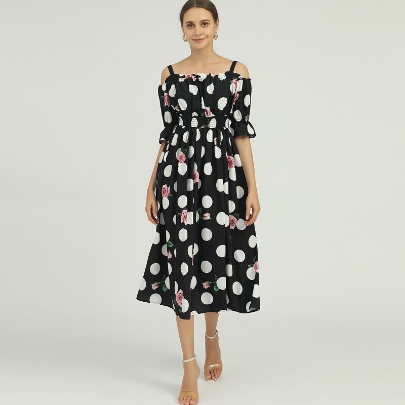 Pinkoz 女性ロングフローラルドレスフェスタポルカドットフラワーカクテルパーティーローブシフォンスパゲッティ Vestidos ピンク 花柄 フラワーデザイン