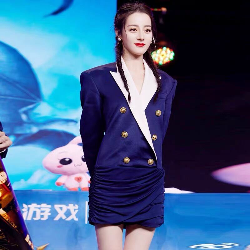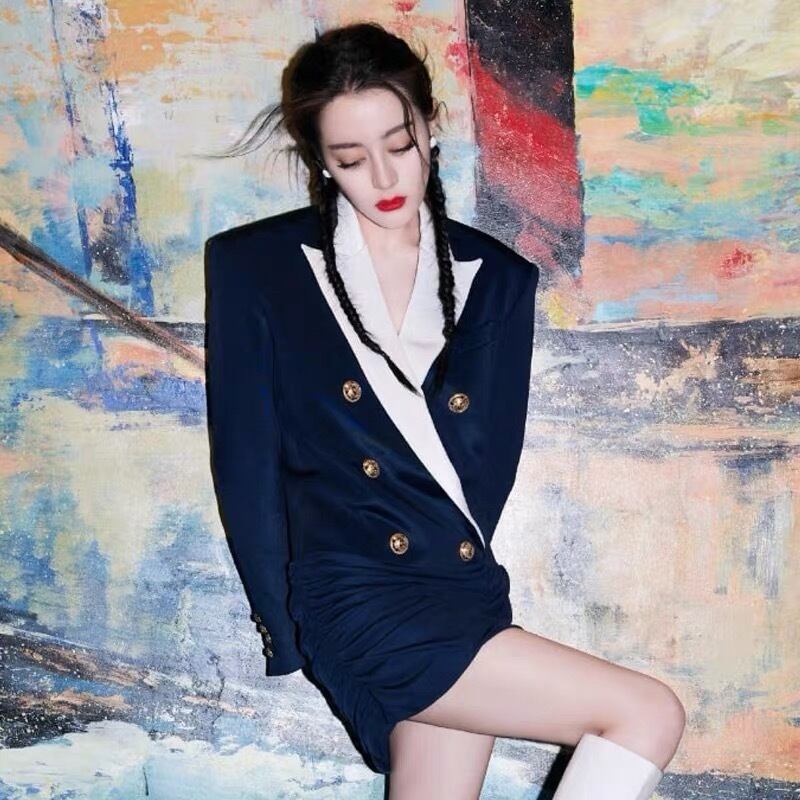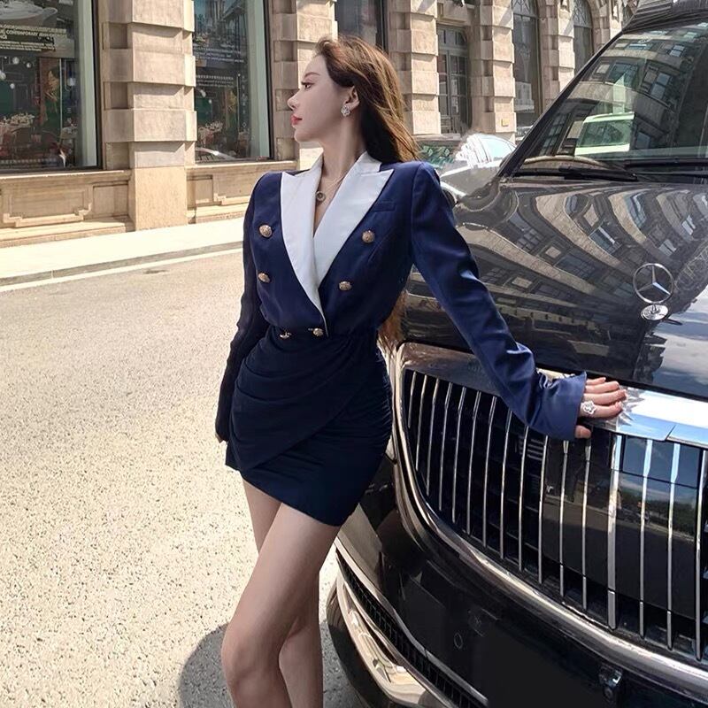 Pinkoz 滑走路デザイナー有名人スタイリッシュなネイビーぼかしダブル ブレスト ミニ ドレス ブレザーぬるぬるパーティー セクシーな春秋のドレス traf ピンク スプリング 春物 オータム 秋物