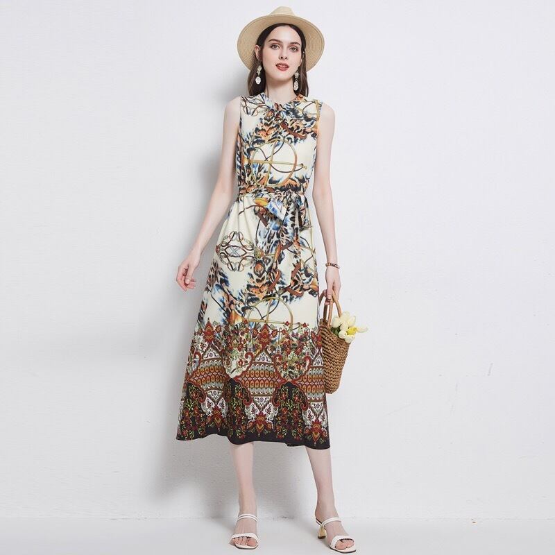 Pinkoz ヴィンテージ シフォン ルーズ ミディ O ネック ノースリーブ ミディ ドレス女性トロピカル花動物ドレス パーティー サッシ vestidos za ピンク 花柄 Oネック ビンテージ