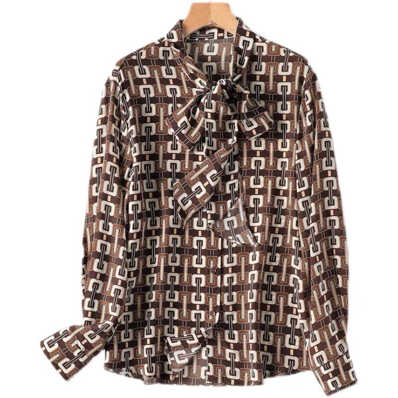 Pinkoz ブラウン チェーン プリント弓シングル ブレスト レース アップ シャツ女性オフィス レディ ファッション ヒット カラー女性トップス シュミーズ ファム топ ピンク リボン フェミニン レースアップ 会社 学校 通勤や通学にも