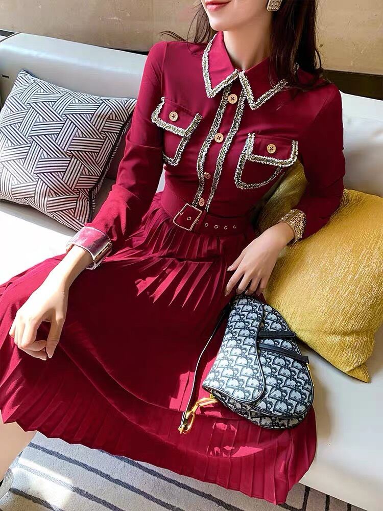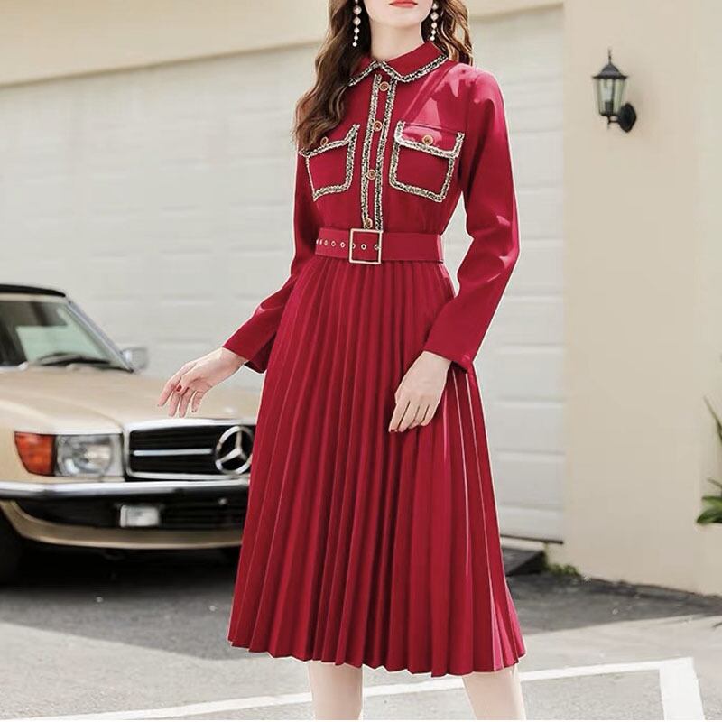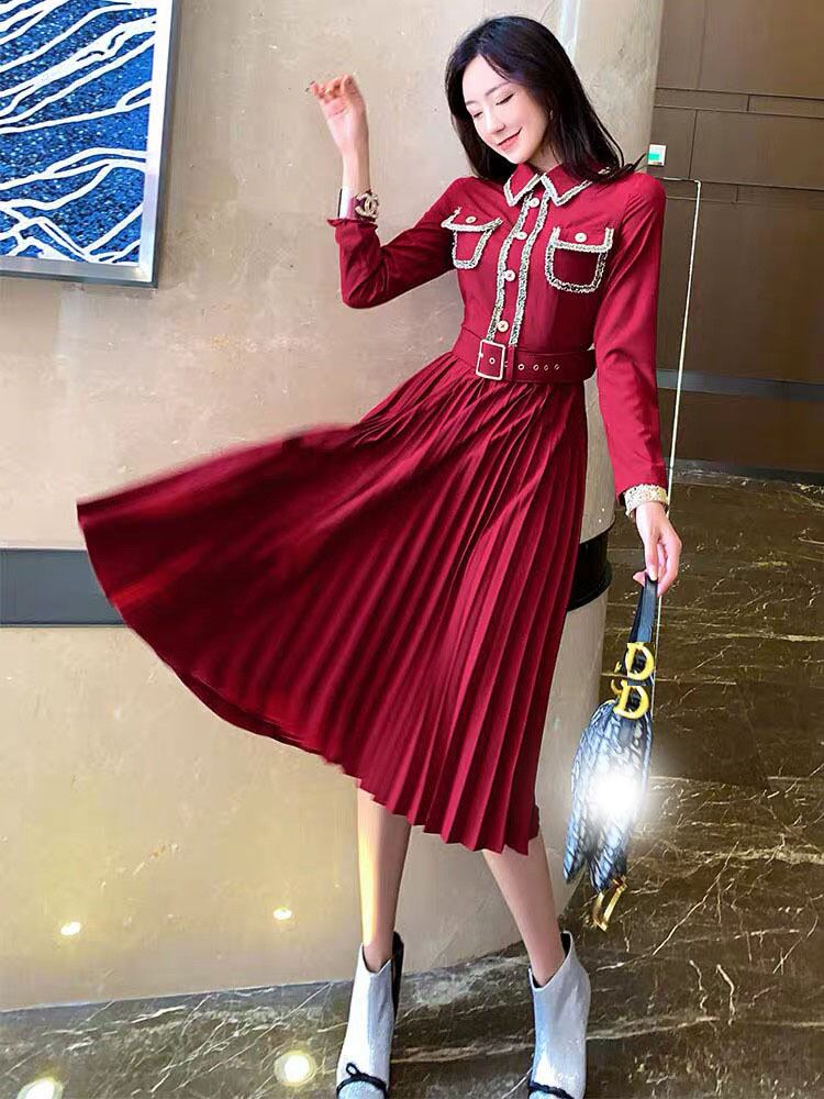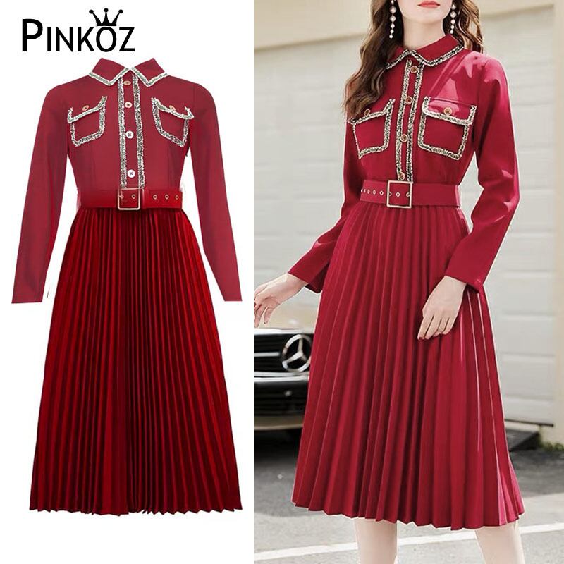 Pinkoz ロングパーティープリーツドレス滑走路春秋のロングドレス女性の高級シャツドレスファッションレディエレガントなニットドレス ピンク スプリング 春物 オータム 秋物