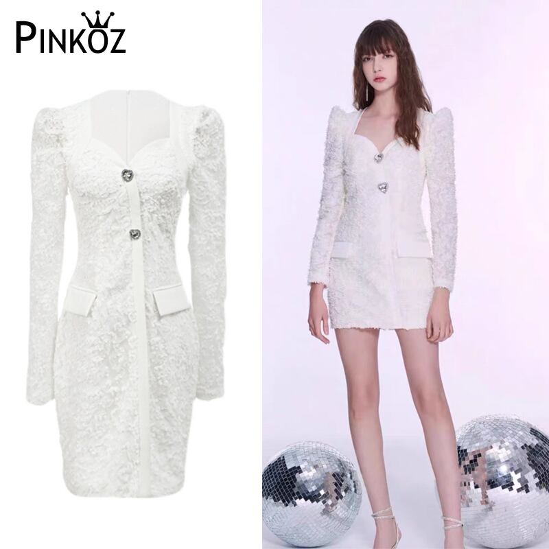 Pinkoz デザイナー白いドレス セクシーな冬フル スリーブぬるぬるボディコン恋人ネック ボタン パフ スリーブ パーティー有名人 vestidos ピンク ホワイト 大人ガーリー スウィート キュート カジュアル ウィンター 冬物