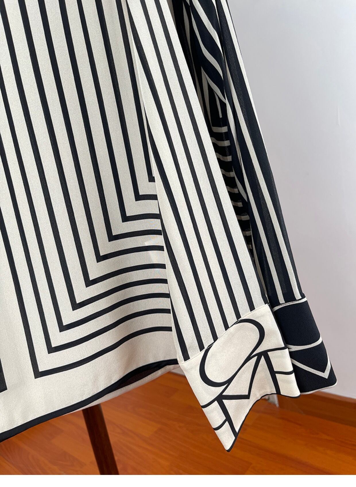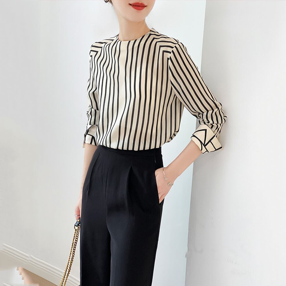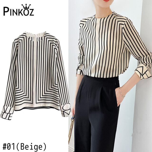 Pinkoz レディース エレガント ストライプ Oネック フルスリーブ レター デザイナー 作業服 ブラウス ジッパー ルーズサイズ OL ヴィンテージ ファッション トップス ピンク ビンテージ