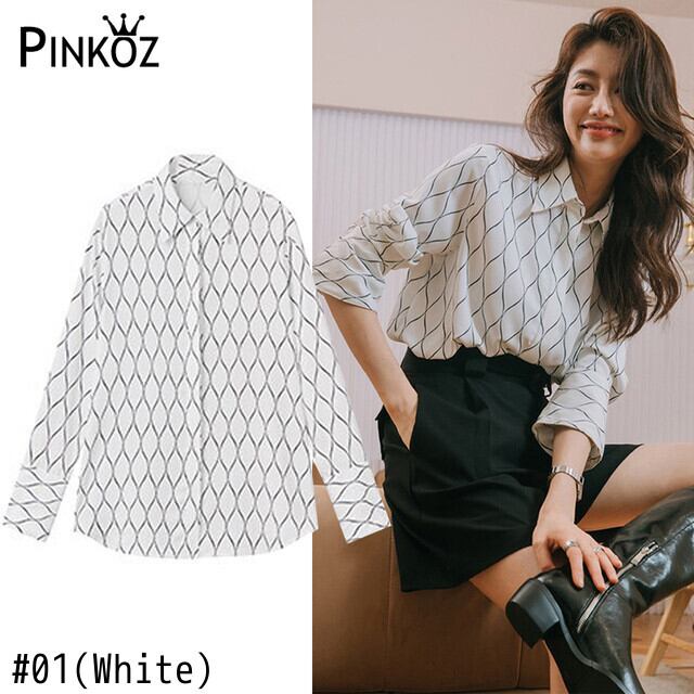 Pinkoz 女性デザイナー白ターンダウン襟フルスリーブカジュアルでエレガントなオフィスレディ白チェック柄ブラウストップスファッションシャツ mujer ピンク ホワイト 会社 学校 通勤や通学にも