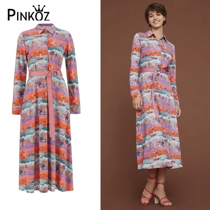 Pinkoz 女性滑走路デザイナー ピンク花柄プリント シングル ブレスト シャツ エレガントなターン ダウン襟有名人マキシ ドレス vestidos za