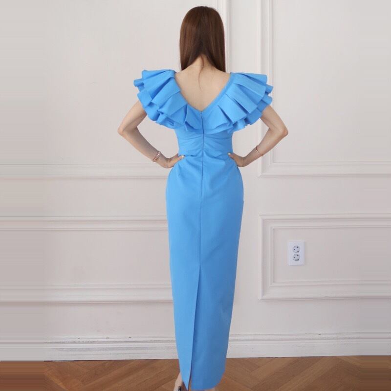 Pinkoz デザイナー滑走路フリル プリーツ マキシ ドレス女性ドレス パーティー ナイト スリム ボディコン v ネック セクシー ローブ デ mujer vestidos ピンク ラッフル Vネック