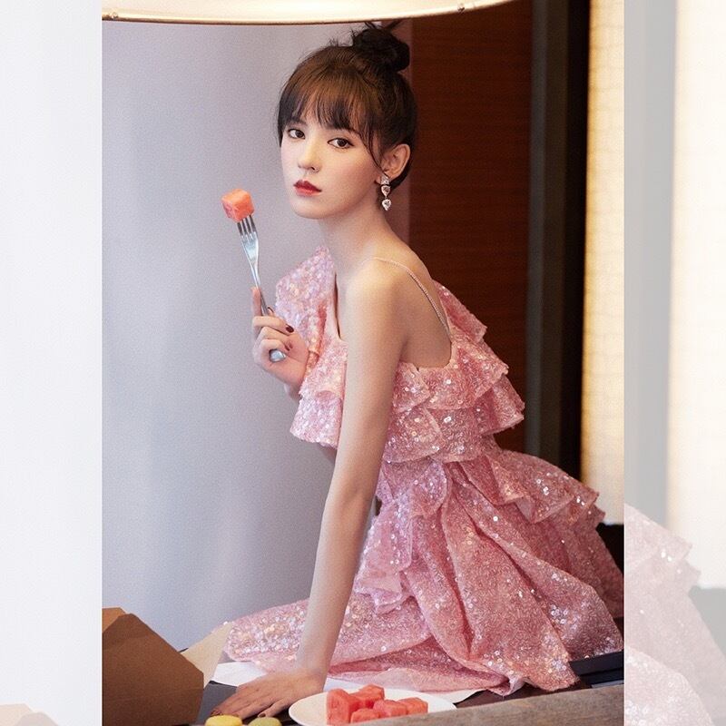 Pinkoz ピンク高級スパンコールミニドレス女性甘いかわいいワンショルダーフリルパーティー誕生日卒業ドレス traf ラッフル 大人ガーリー スウィート キュート カジュアル