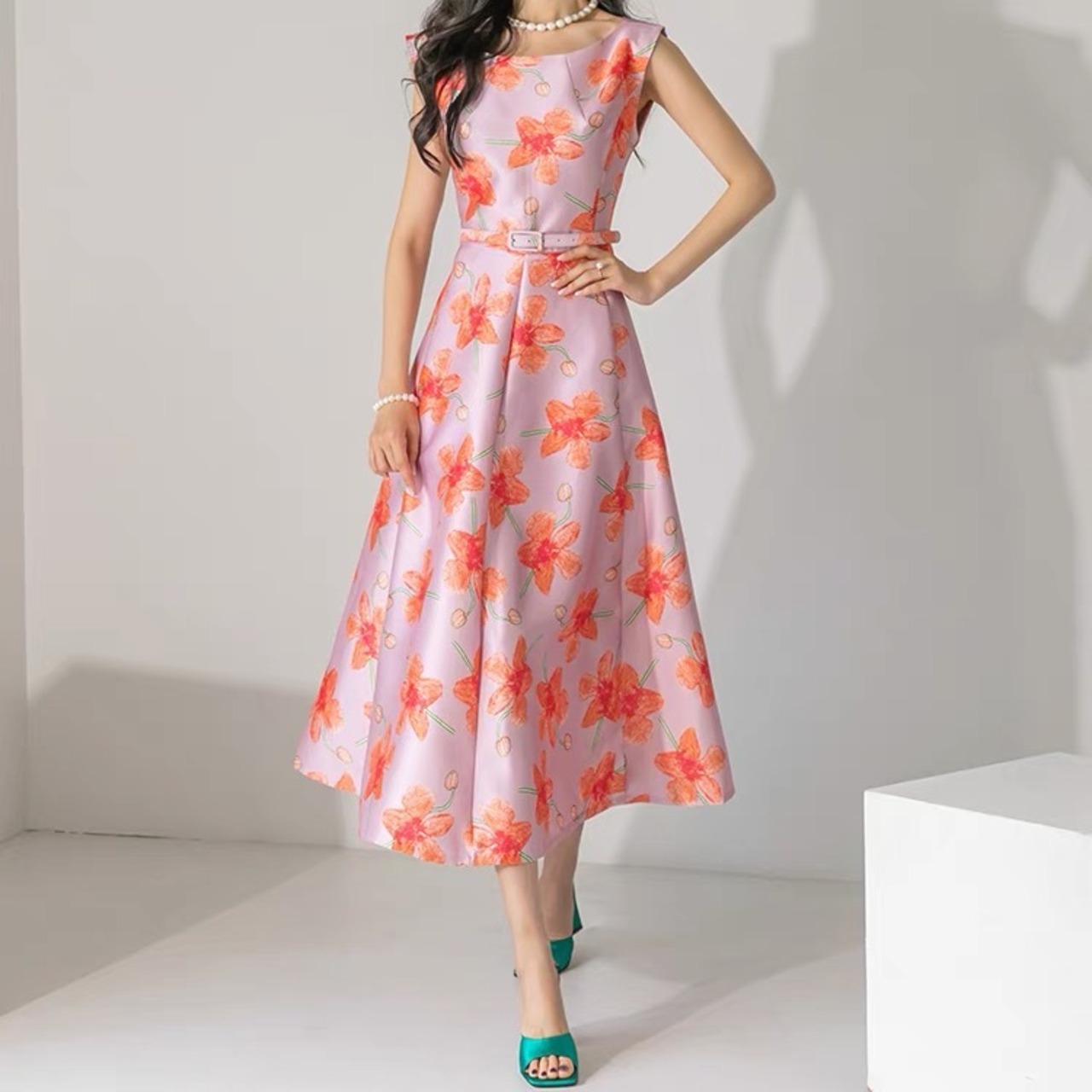 Pinkoz ガウン ボール ドレス 夏 春 女性 ランウェイ オレンジ フローラル ノースリーブ Vestidos Traf ピンク スプリング 春物 サマー 夏物 花柄