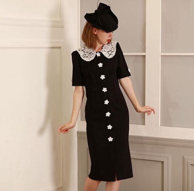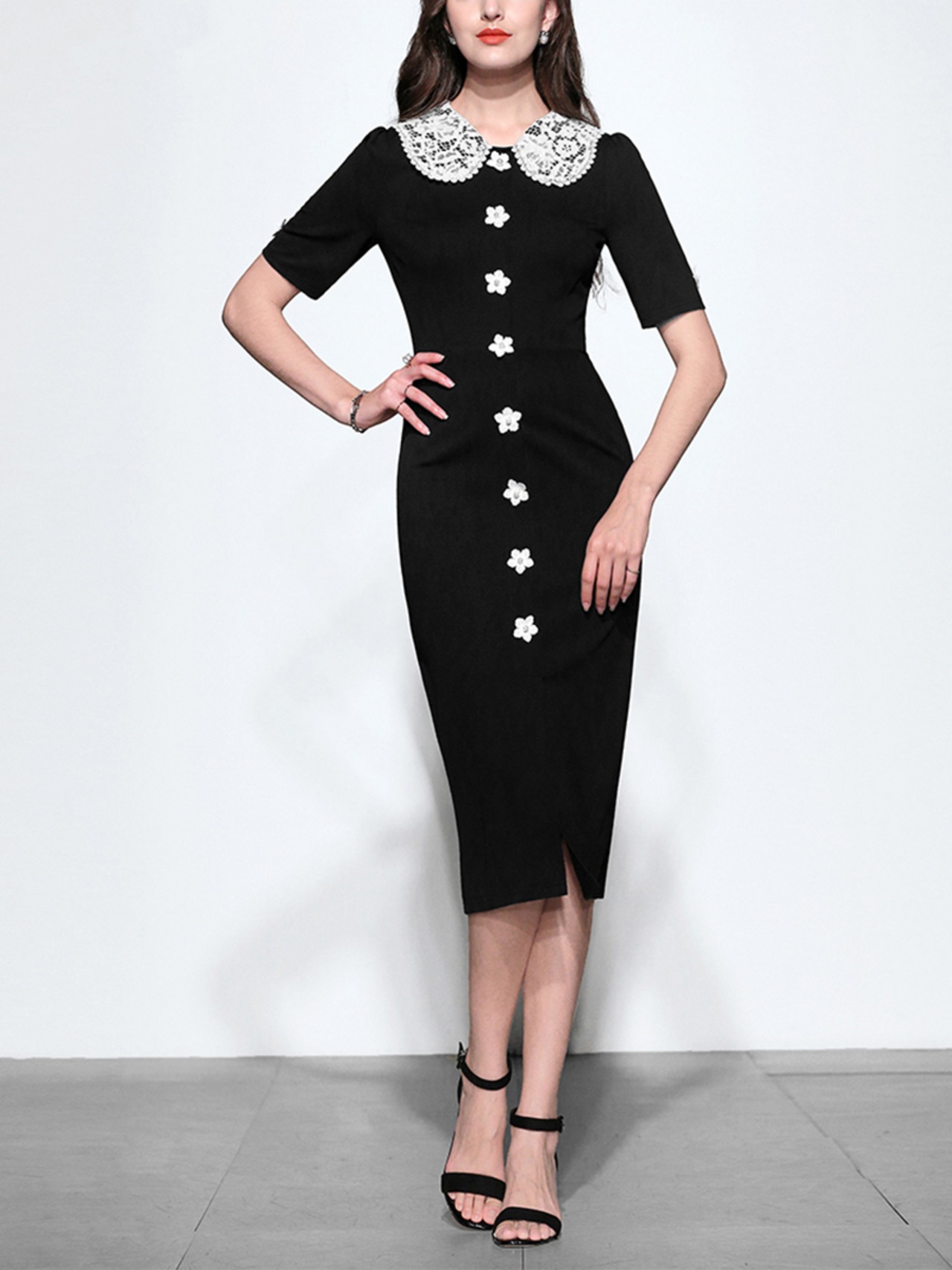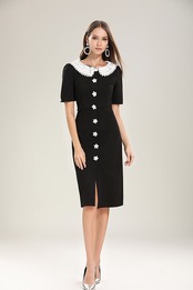 Pinkoz ランウェイ ピーター パール ボタン スプリット ボディコン ドレス 秋冬 半袖 レース ラペル カラー ミディ パーティー ショート ピンク ハーフスリーブ オータム 秋物 ウィンター 冬物 真珠