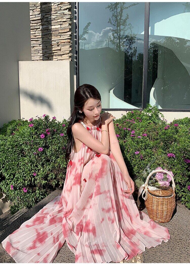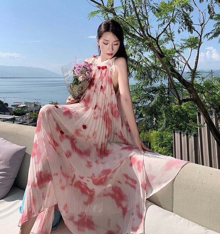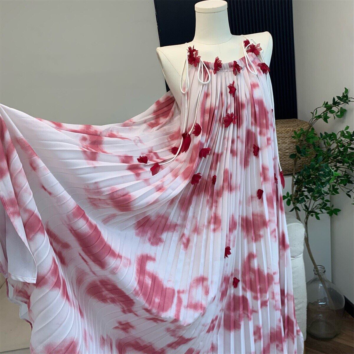 Pinkoz 滑走路デザイナー ホリデー ロング ドレス ホルター ノースリーブ夏シックなパーティー ルーズ ドレス女性アップリケ花プリーツ ピンク サマー 夏物 フラワーデザイン