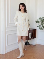 Pinkoz ランウェイ デザイナーズ ホワイト ペンシル 膝丈 ドレス ボタン Oネック ポケット 秋冬 ドレス エレガント 作業服 ヴィンテージ ピンク オータム 秋物 ウィンター 冬物 ビンテージ
