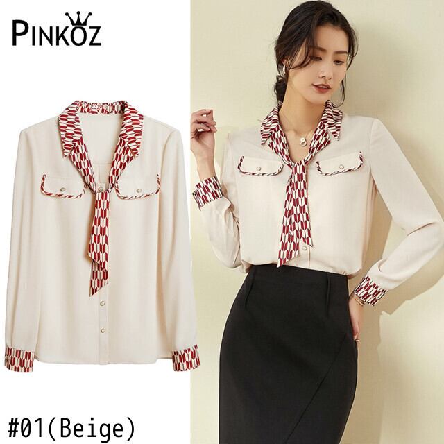 Pinkoz エレガントな女性ドレス水玉ベージュ シフォン ブラウス女性オフィス レディー ポケット春夏シャツ ファッション ヒット カラー y2k ピンク スプリング 春物 サマー 夏物 会社 学校 通勤や通学にも