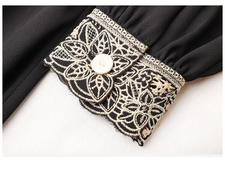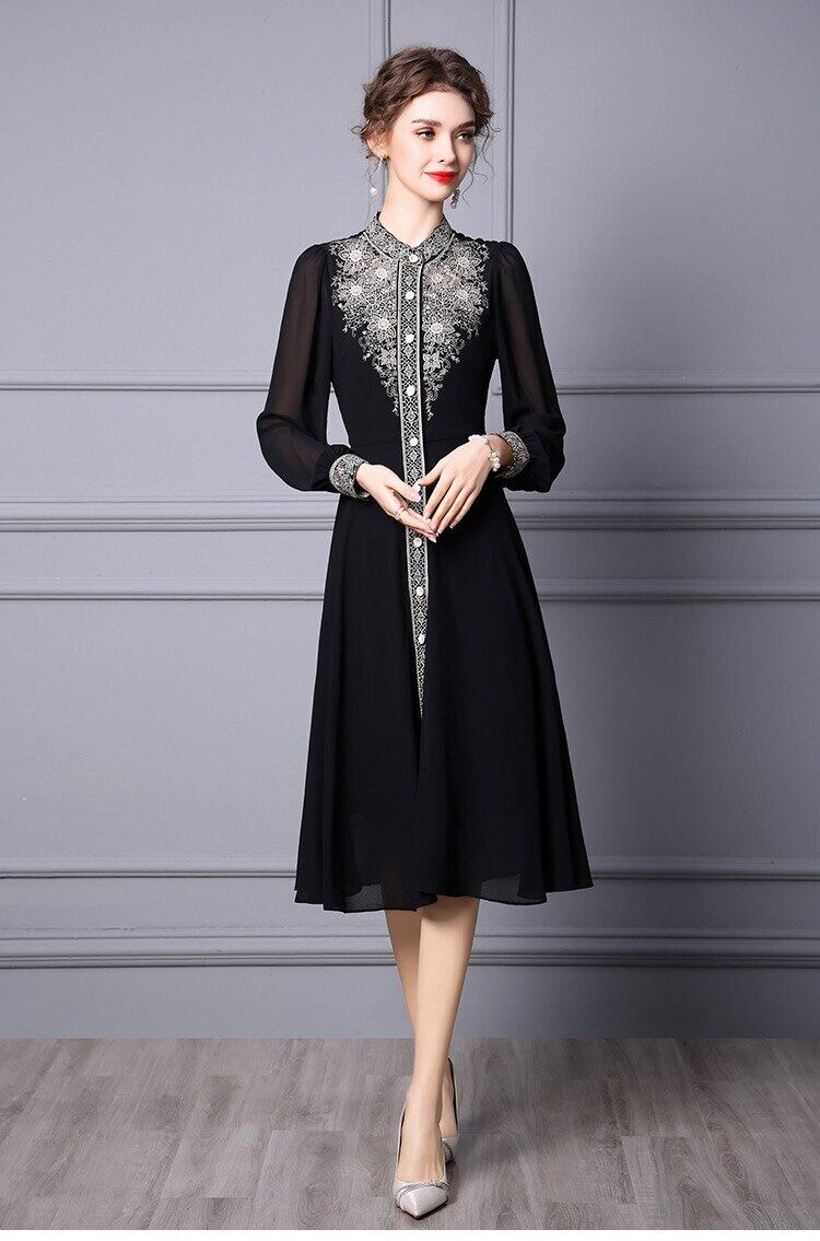 Pinkoz 女性のエレガントな黒ミディドレスシフォンゴールドライン embroideried スタンドカラー秋冬 A ラインドレスローブデ mujer シック ピンク ブラック 刺繍 オータム 秋物 ウィンター 冬物 Aライン
