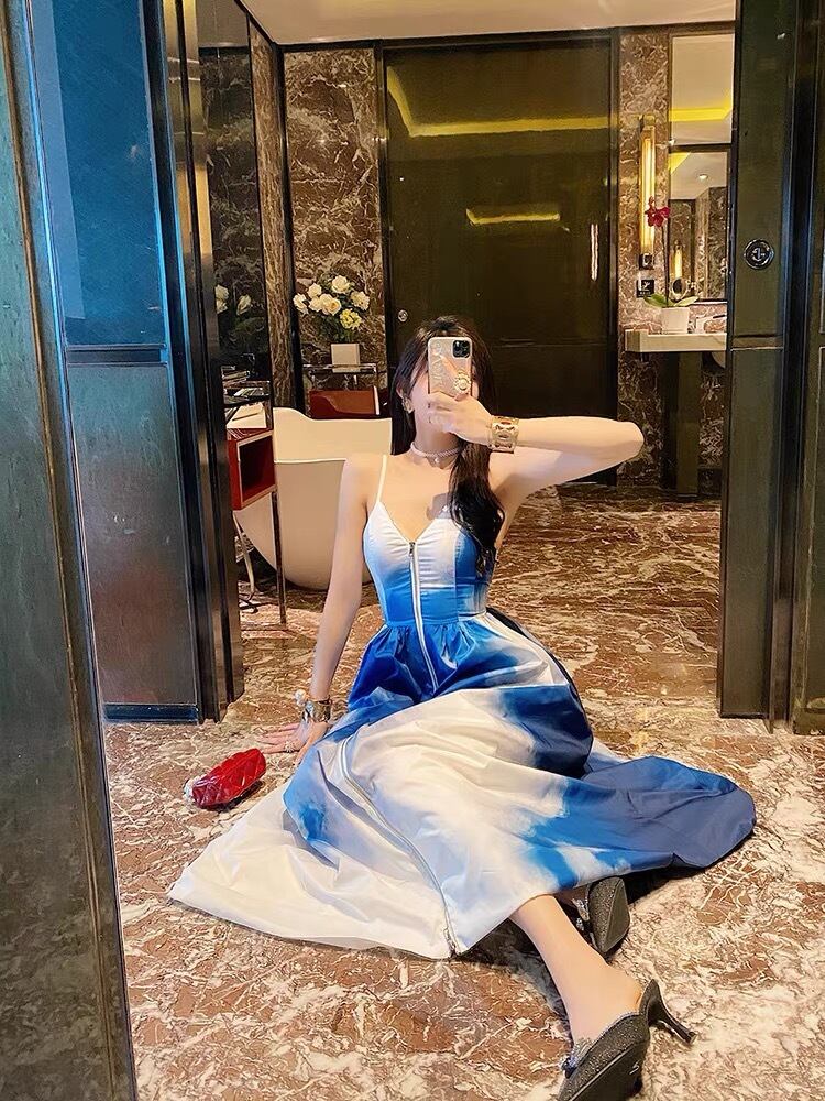 Pinkoz 滑走路デザイナー スタイリッシュな青白塗装スパゲッティ ストラップ キャミソール v ネック ジッパー ミディ ドレス パーティー シックな夏のローブ ピンク ホワイト ブルー サマー 夏物 Vネック