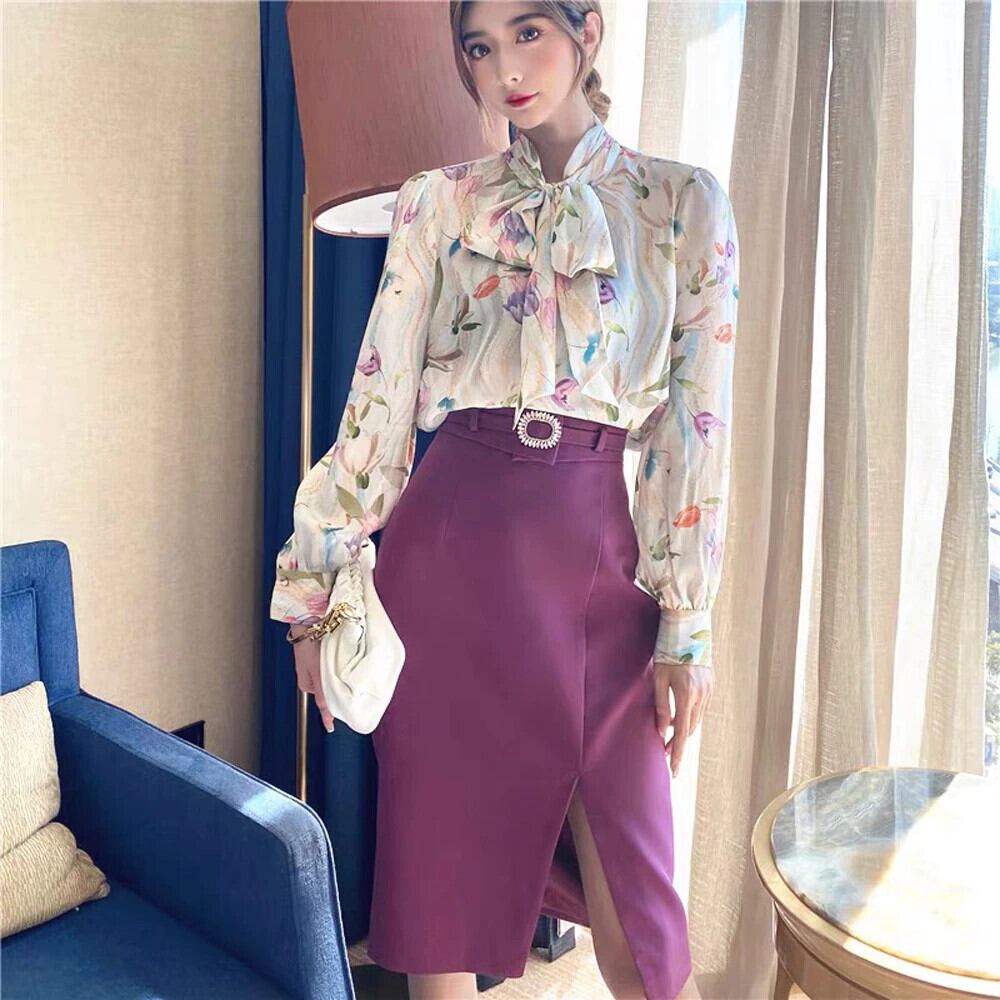 Pinkoz デザイナー フローラル プリント ボウ カラー シフォン ブラウス女性ファッション ヒット カラー ヴィンテージ オフィス レディー クロップド トップス シャツ フレンチ ピンク リボン 花柄 ビンテージ 会社 学校 通勤や通学にも