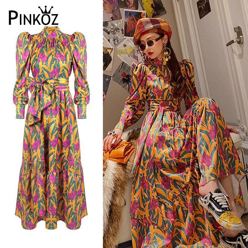 Pinkoz デザイナー スタイルの女性ミディ ドレス花柄プリント スタンド カラー フル ランタン スリーブ レースアップ パーティー ドレス サッシ vestidos 新 ピンク ランタンスリーブ