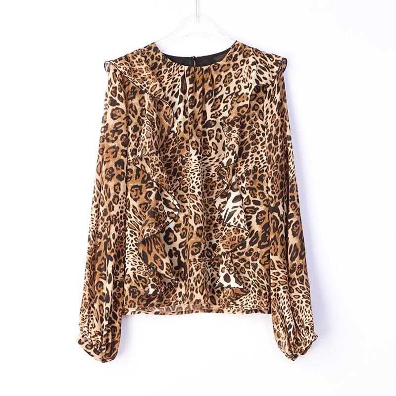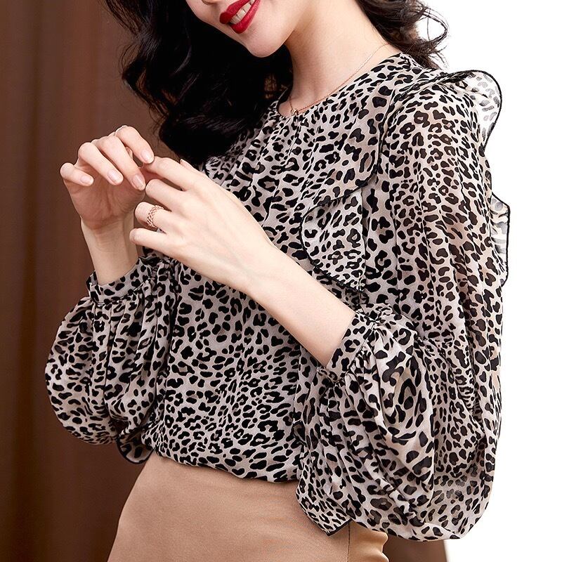 Pinkoz 女性ヒョウ女性ブラウスフリルシフォンエレガントなオフィスレディ緩いカジュアル女性化学者ファム着物ファムチュニキ ピンク ラッフル フェミニン 会社 学校 通勤や通学にも