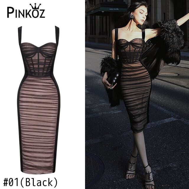 Pinkoz デザイナーメッシュぬるぬるキャミソールセクシーなドレス女性パーティーナイトミディ黒ディナーファッションシックなドレス traf ピンク ブラック