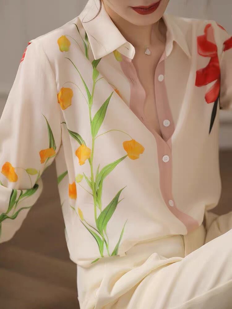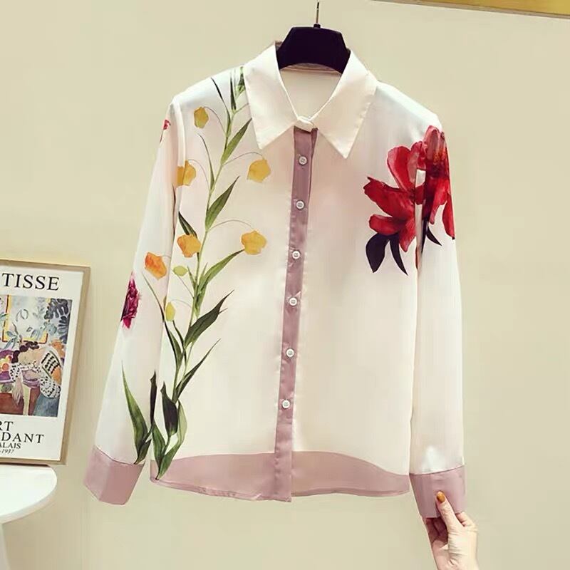 Pinkoz 滑走路 sdesigner 赤い花プリント ターン ダウン襟女性ブラウス エレガント レディ作業服ファッション トップ シャツ シックな traf ピンク レッド フラワーデザイン