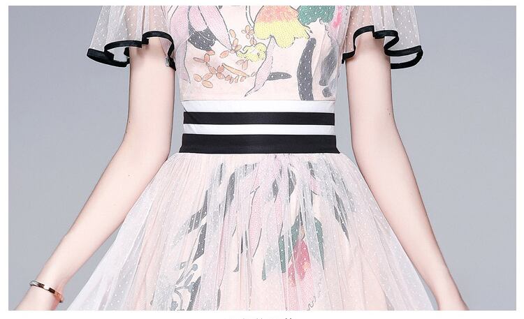 Pinkoz 滑走路デザイナー花トロピカル プリント ハイ ウエスト バタフライ メッシュ ミディ ドレス女性因果ヴィンテージ ピンク ベージュ ローブ ハイウェスト フラワーデザイン ビンテージ