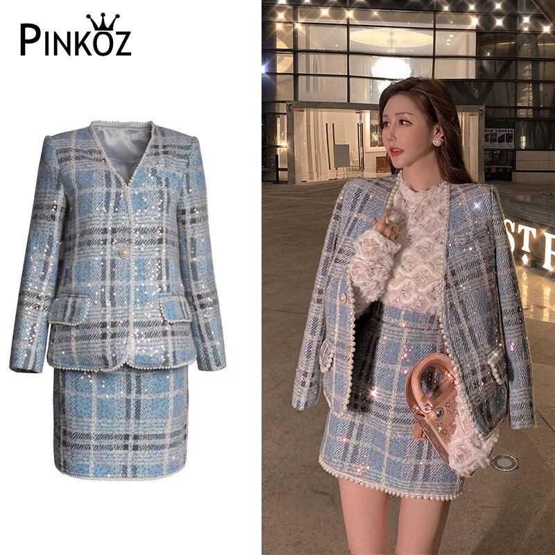 Pinkoz レディース デザイナー 水色 ビーズ スパンコール Vネック ツイード オフィスレディ ジャケット コート 冬 フェスファッション 2点セット 座 ピンク ブルー ウィンター 冬物 会社 学校 通勤や通学にも