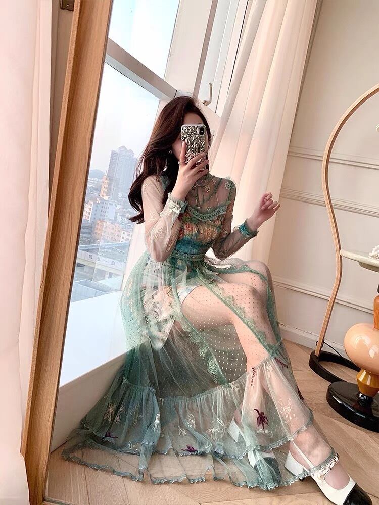 Pinkoz ランウェイ フラワー シャツ ドレス レディース スタンド カラー フリル 長袖 プリント グリーン ミディ パーティー Vestidos ローブ ロング ピンク ラッフル フラワーデザイン