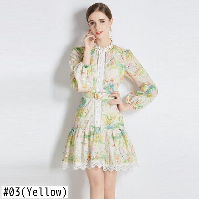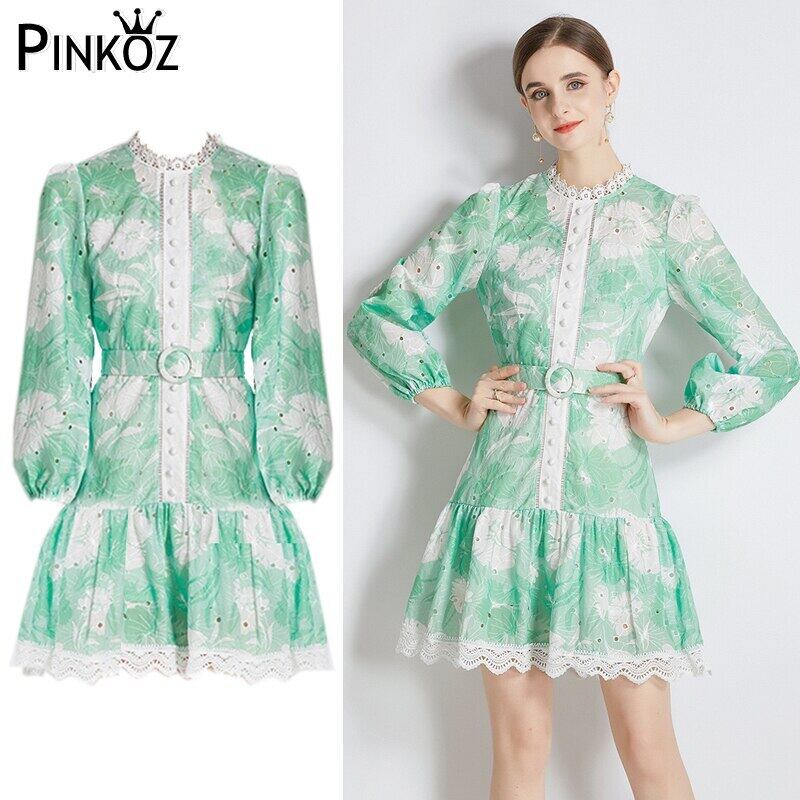 Pinkoz 女性デザイナー膝丈ドレス グリーン花中空アウト パッチワーク レース ボタン春秋ドレス ベルト vestidos ピンク スプリング 春物 オータム 秋物 ハーネス 花柄