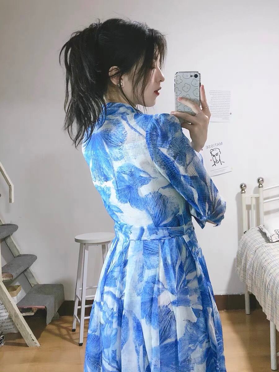 Pinkoz デザイナー女性ミディドレスフラワープリントボウレースアップシングルブレストシャツファムホリデーパーティードレスファッション vestidos ピンク リボン フェミニン フラワーデザイン
