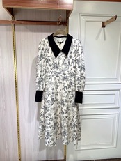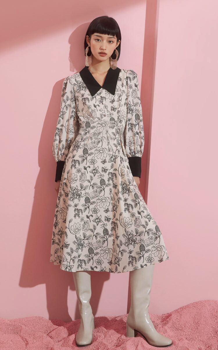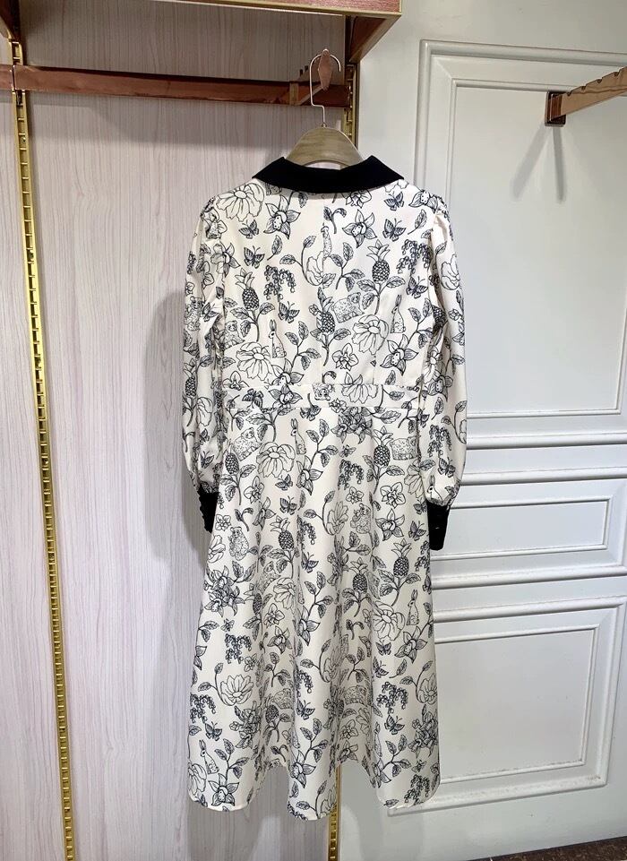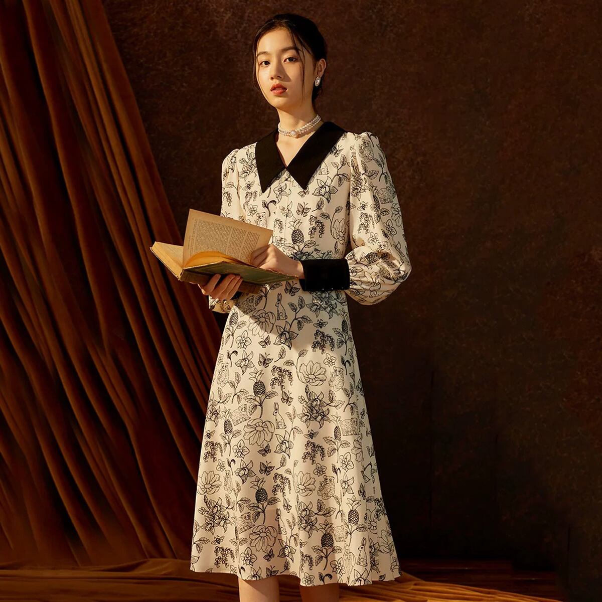 Pinkoz 滑走路デザイナー ヴィンテージ vestidos グレー ターン ダウン襟ボタン A ライン グレー花柄長袖ミディ ドレス ローブ ロング ピンク Aライン ビンテージ