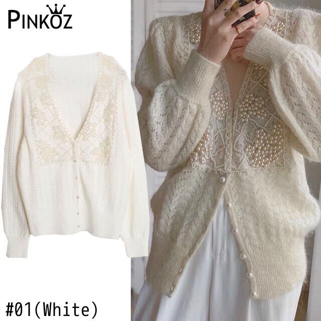 Pinkoz エレガントなフレンチ スタイルの白いカーディガン女性緩い春夏薄い長袖セーター ビーズ高級トップス女性 traf ロング ピンク ホワイト スプリング 春物 サマー 夏物