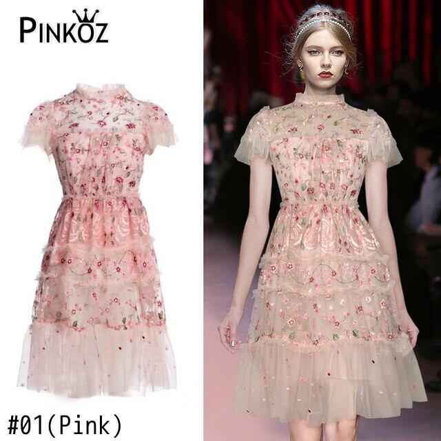 Pinkoz 滑走路デザイナー ピンク花刺繍高級半袖夏休日パーティー ドレス ハイ ウエスト ローブ ハイウェスト ショート ハーフスリーブ サマー 夏物 花柄