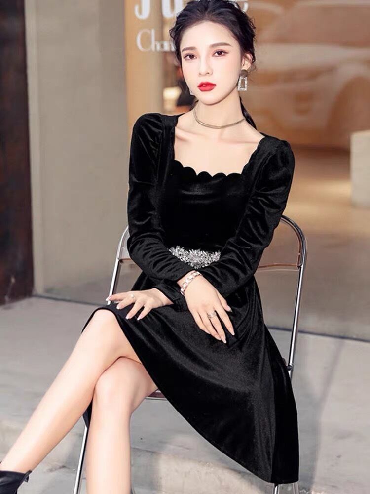 Pinkoz ゴシックシックな女性ミディ A ラインドレスベルベットスクエアカラー黒のエレガントなカジュアルな若い女性のパーティードレスとベルト vestidos ピンク ブラック ハーネス Aライン スクウェア