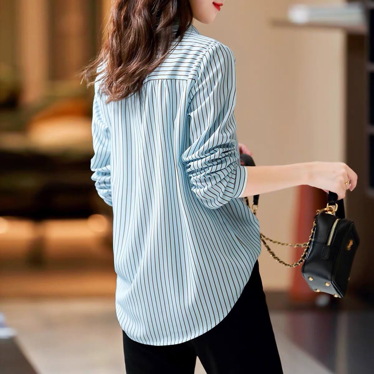 Pinkoz 女性ブルーストライプカジュアル女性シャツフルスリーブかわいい猫 embroideried エレガントなフランスのスタイリッシュなデザイナーブラウストップス女性 ピンク 刺繍 大人ガーリー スウィート キュート