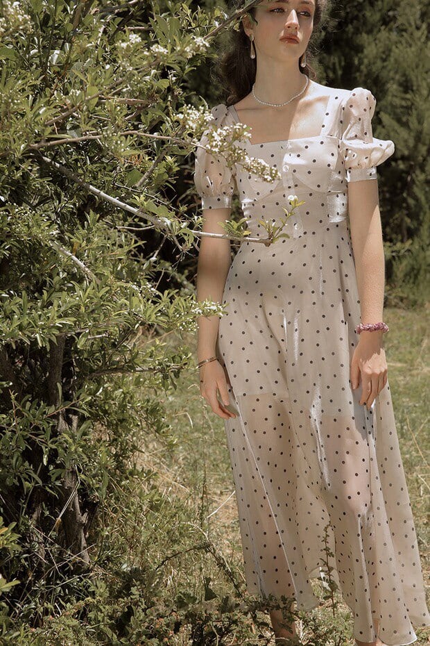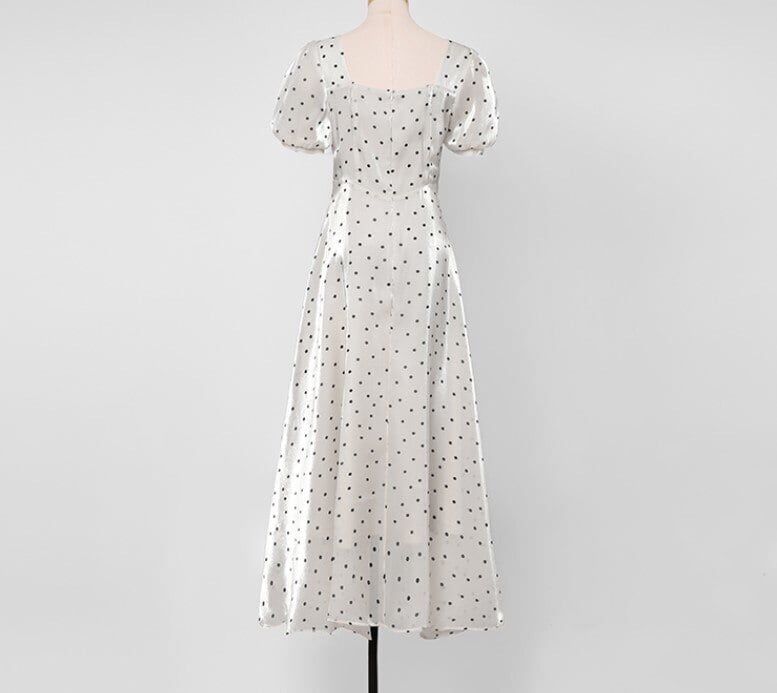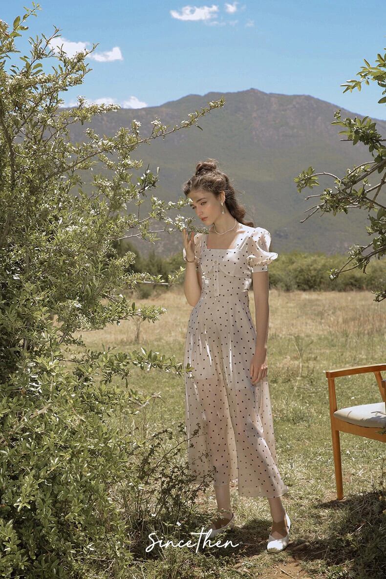 Pinkoz ポルカドット シフォン サマードレス レディース スクエアカラー Aラインドレス ドレス レトロ ピンク 夏物 スクウェア
