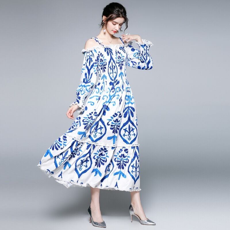 Pinkoz デザイナー夏ルース スラッシュ ネック マキシ ドレス パッチワーク レースシャーリング ロング パフ スリーブ ブルー プリント ローブ デ mujer vestidos za ピンク サマー 夏物