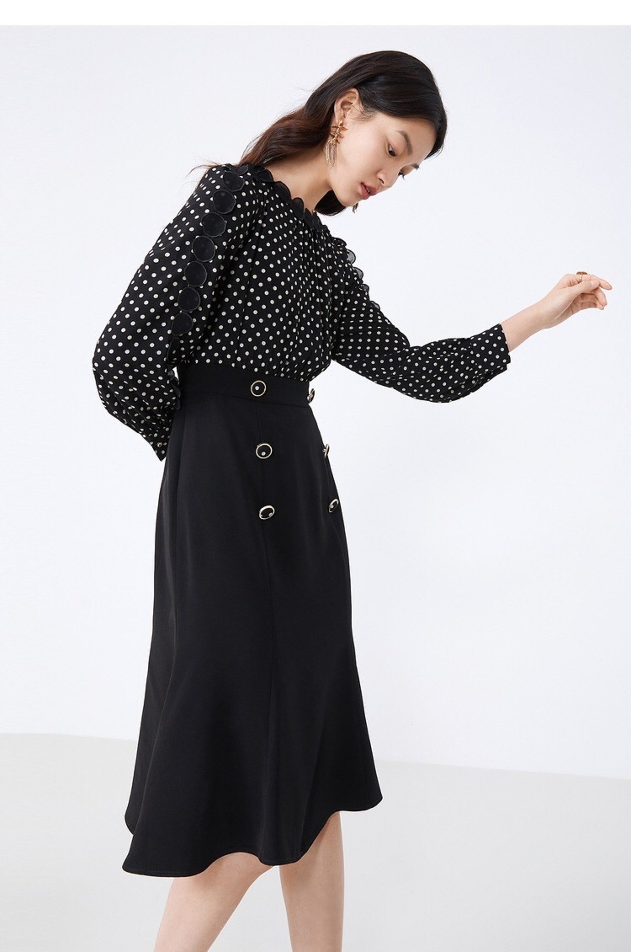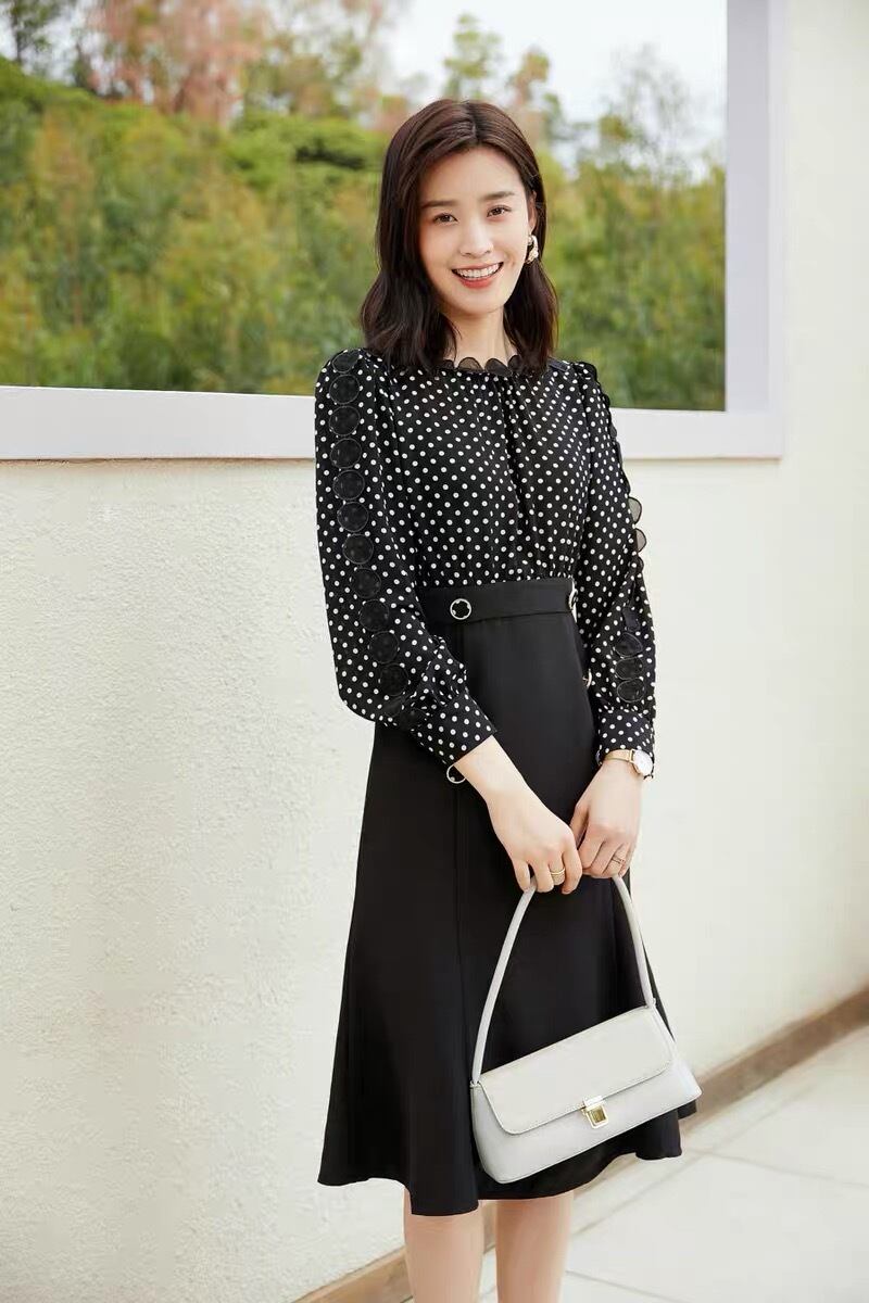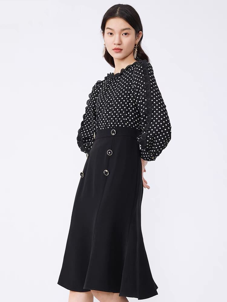 Pinkoz 女性ミディドレスフルスリーブ黒のエレガントなオフィスレディ水玉 traf ハイウエストセレブドレスファムパーティーカジュアルローブ ハイウェスト ピンク ブラック フェミニン 会社 学校 通勤や通学にも